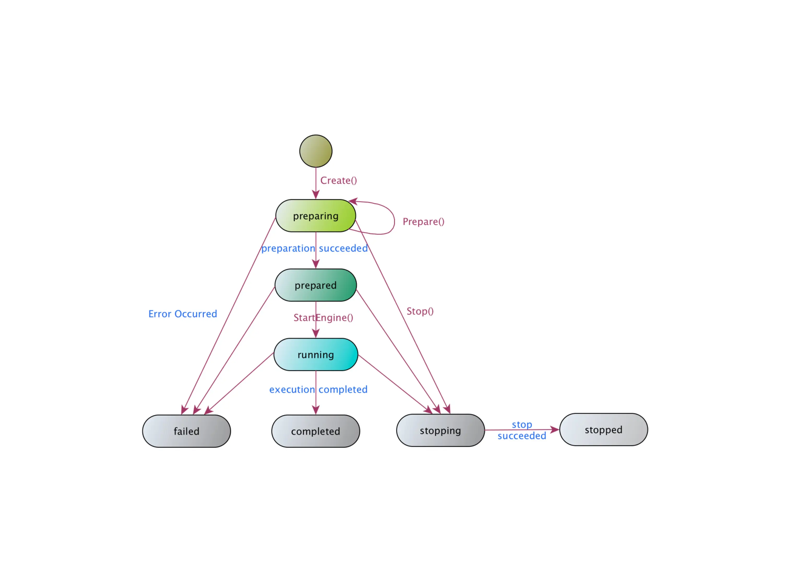 Maxim 状态机是 Maxim 分布式的核心,控制中心和各个 Agent 的行为都受状态机变化的影响。 创建任务并开始执行以后,各个任务分片(JobSliceExecution)首先会进入 preparing 状态,各个 Agent 会从云存储下载压测脚本和各自对应的那些数据块,下载完成后再将这些数据块合并成一个 Json 数据文件作为压测脚本的数据输入。如果下载失败则会重试,即 Prepare。如果所有 Agent 都成功下载了脚本和数据,则各个 JobSliceExecution 会相继进入 prepared 状态,等所有 JobSliceExecution 进入 prepared 状态后,JobExecution 也会进入 prepared 状态,并向各个 Agent 发起执行指令,各个 JobSliceExecution 进入 running 状态,等所有 Agent 执行完成且各个 JobSliceExecution 变成 completed 状态之后,JobExecution 也会进入 completed 状态,此时压测任务执行完成并生成压测报告。如果各个任务分片在 preparing、prepared 或 running 过程中有任何一个出错,则出错的分片会进入 failed 状态并通知控制中心,控制中心则控制其他分片中止正在执行的任务并进入 Stopping 状态,等这些分片中止成功并都变成 stopped 状态后,JobExecution 会被置成 failed 状态。当然了,也可以手动停止压测任务,这时候 JobSliceExecution 和 JobExecution 都会被置成 stopping->stopped 状态。
