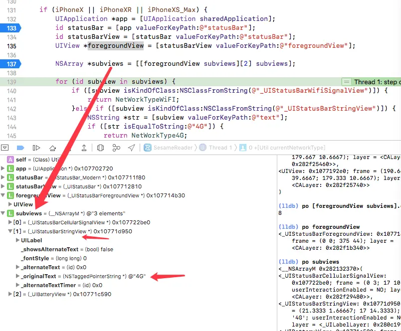 注意:利用这种遍历的方法在iPhoneX/Xs/XR/Xs Max 机型上运行是崩溃,其实根本原因是手机刘海儿的状态栏子视图发生了变化,用以下方法便可解决。