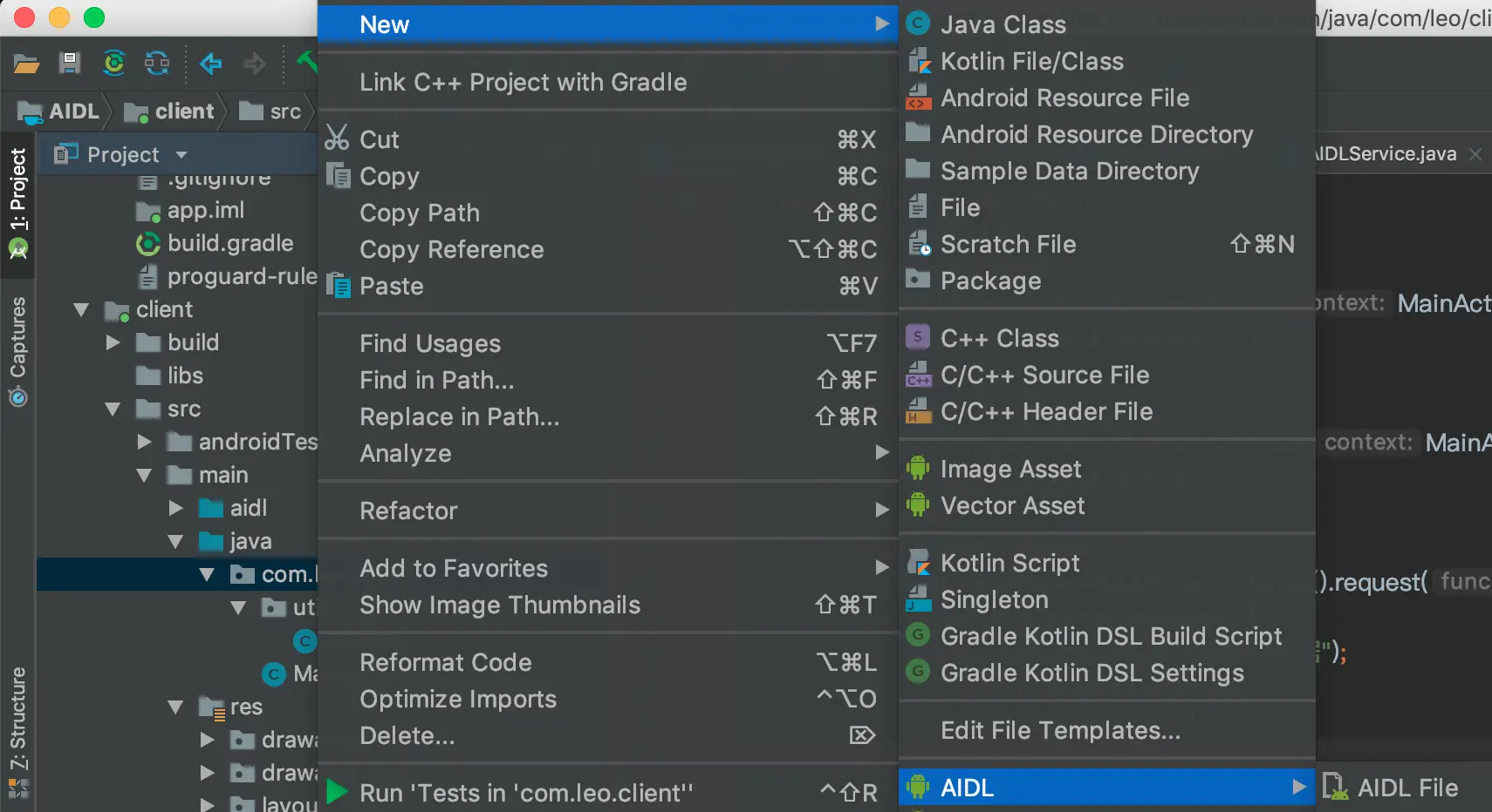 如下图,右键New创建AIDL文件,会直接生成一个AIDL模板类IService.aidl。