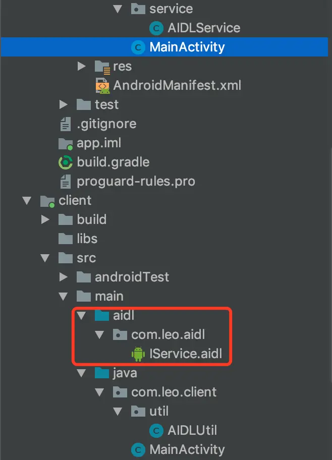 插入一个题外话,aidl的存放位置有两种,一种是像图中一样,与java文件夹同级创建aidl文件夹,然后在其中创建包结构,然后aidl文件存放其中;另一种方式是放到java的结构目录中,使用这种方式需要在build文件中做相应配置:
