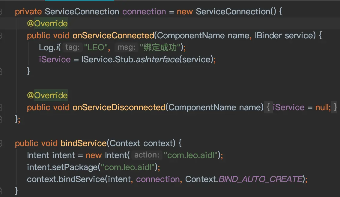 接着创建一个Service(AIDLService.class)返回IService的句柄,如下图,取一个action如<action android:name="com.leo.aidl" />