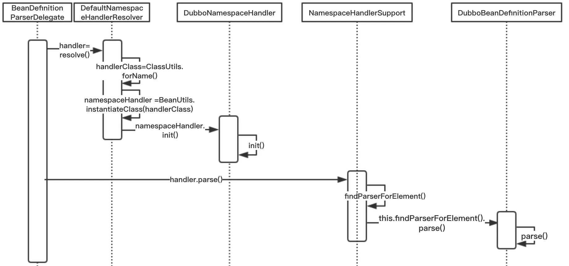 http://dubbo.apache.org/schema/dubbo; - 根据 step1 获取到的 namespaceUri ,获取对应的 NamespaceHandler 对象。这里会调用 DefaultNamespaceHandlerResolver 类的 resolve() 方法,我们下面会分析;