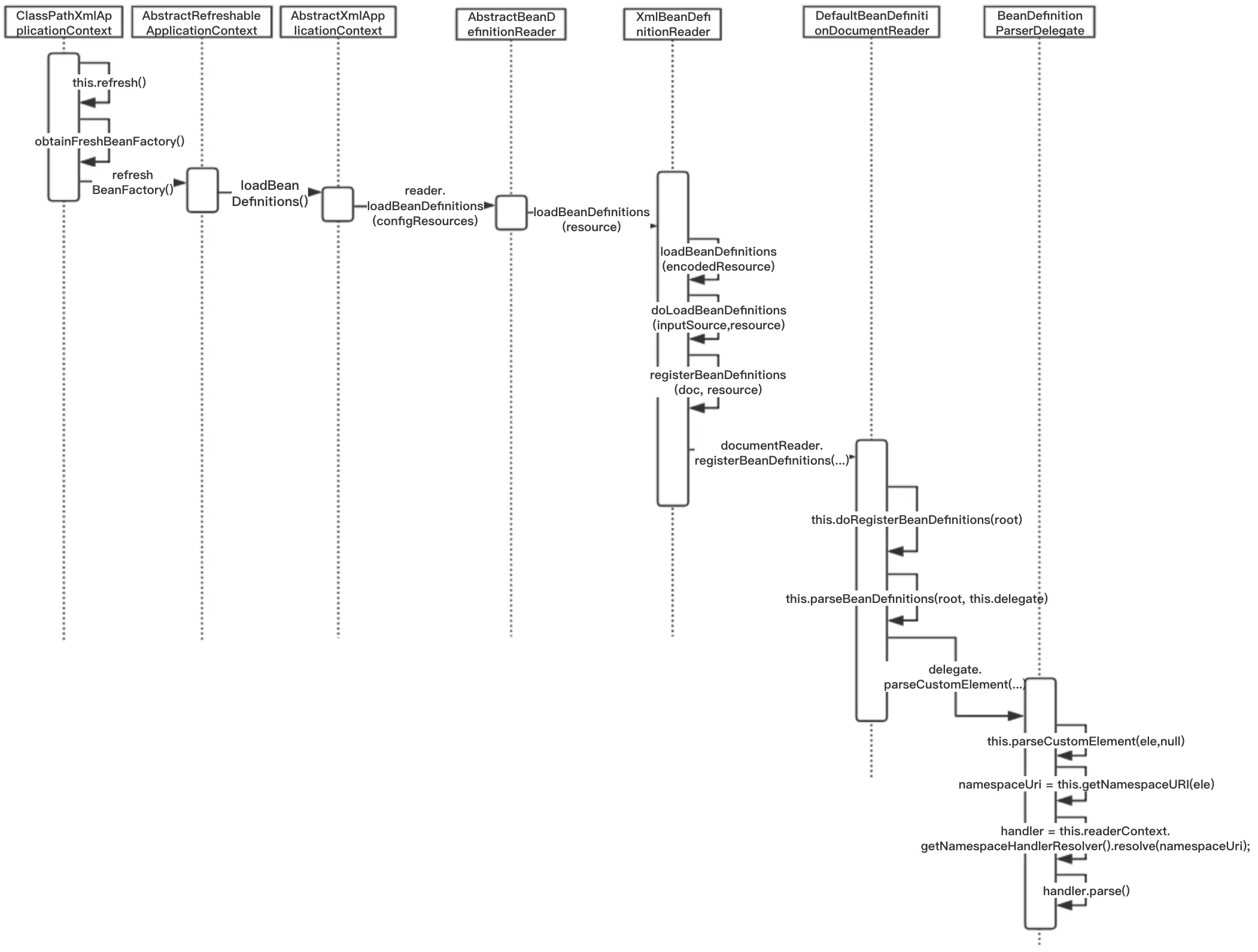 终于进入到本文的重头戏环节了。在介绍 Dubbo 自定义 XML 标签解析前,先放一张图帮助大家理解以下 Spring 是如何从 XML 文件中解析并加载 Bean 的。