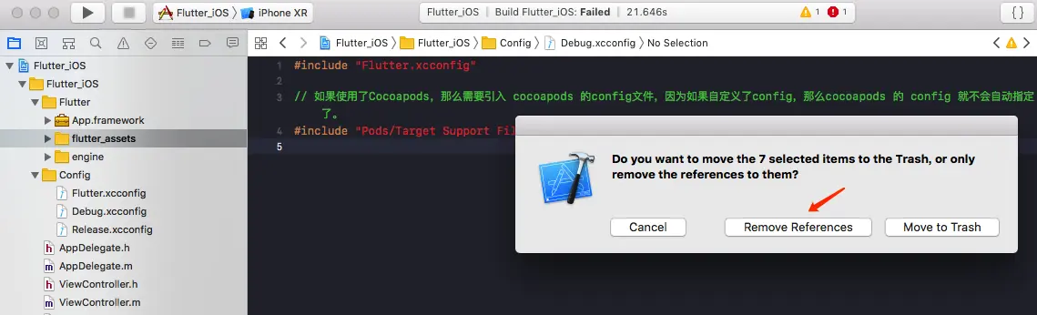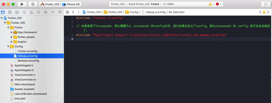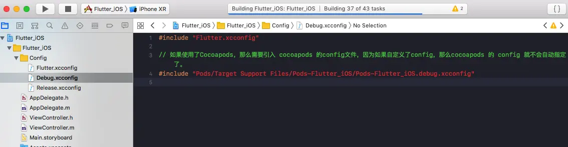 Flutter.xcconfig是指向外目录 flutter module 的Generated.xcconfig文件路径引用文件,其他两个代表Xcode的环境配置文件。