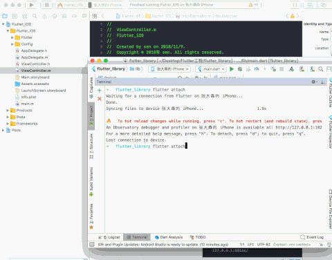 选择main.dart,flutter代码主文件,在终端中进行 flutter attact 等待连接。