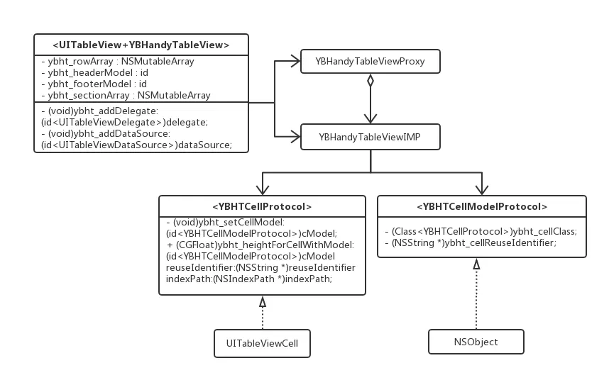 正如代码所见,需要传入的是实现YBHTCellModelProtocol协议的实例,同时需要对应的UITableViewCell实现YBHTCellProtocol协议(可对比 UML 类图)。