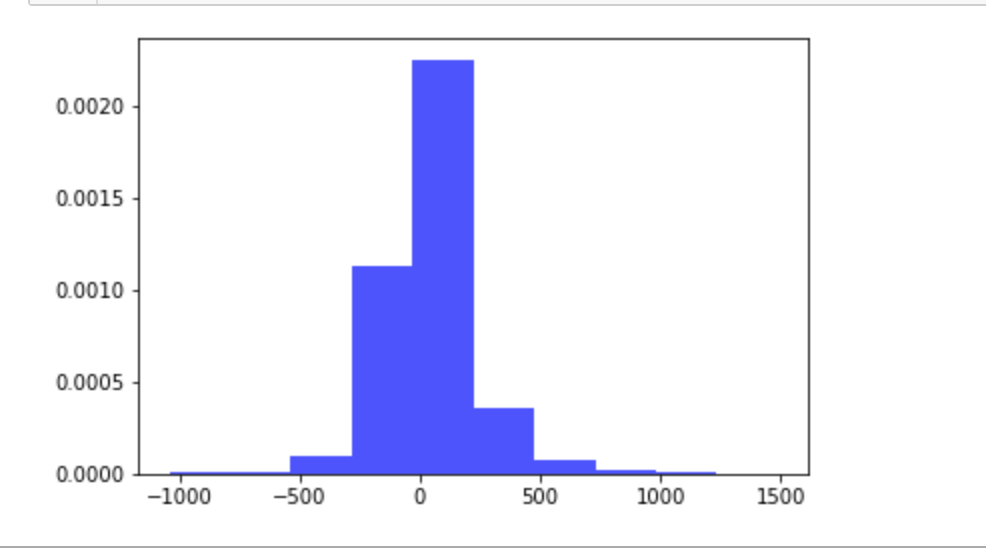 num_bins = 10plt.hist(df['Amount'], num_bins, normed=1, facecolor='blue', alpha=0.5)plt.show()And it outputs: