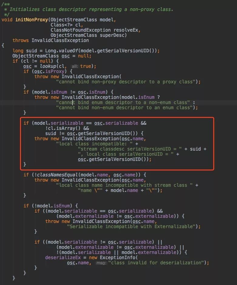 在反序列化过程中,对serialVersionUID做了比较,如果发现不相等,则直接抛出异常。