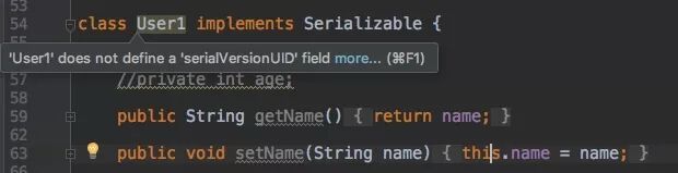 为了确保我们不会忘记定义serialVersionUID ,可以调节一下Intellij IDEA的配置,在实现Serializable 接口后,如果没定义serialVersionUID 的话,IDEA(eclipse一样)会进行提示: