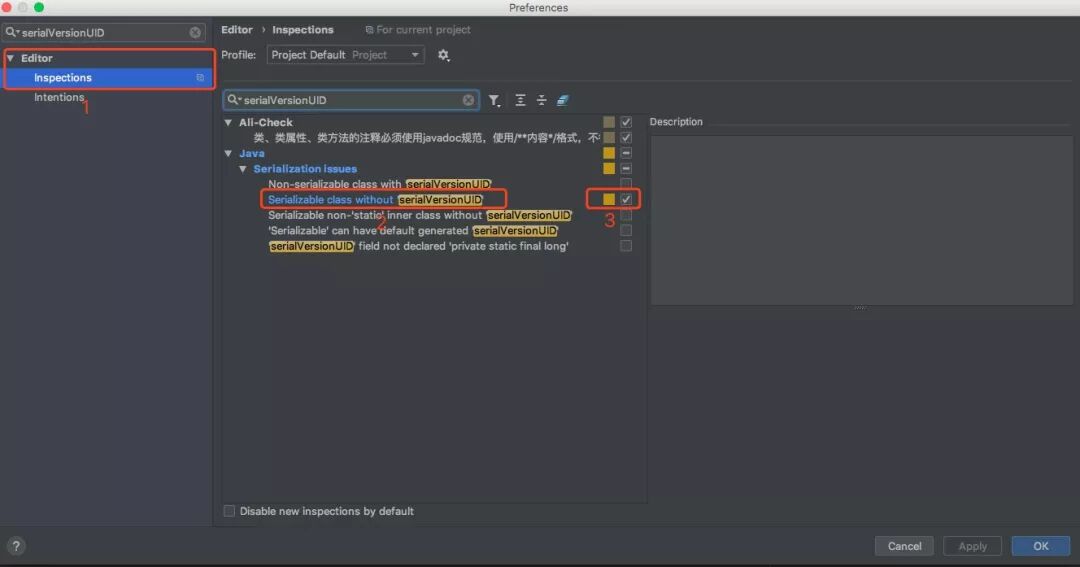 在图中标号3的地方(Serializable class without serialVersionUID的配置),打上勾,保存即可。
