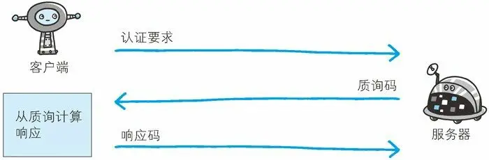 所谓质询响应方式是指,一开始一方会先发送认证要求给另一方,接着使用从另一方哪接收到的质询码计算生成响应码。最后将响应吗返回给对方进行认证的方式。
