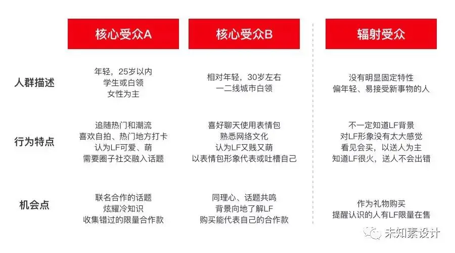结合社交平台上的观察和简单访谈等快速的用研方法进行验证,我们可以把LINE FRIENDS的两种核心受众与一种附带受众列出来,而他们的需求以及心甘情愿掏钱的原因也变得更加清晰。