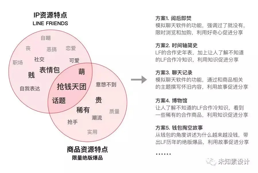 而内容包装的重点,则放在如何利用绝版资源产生内容、并与用户产生情感共鸣上。作为表情包,LINE FRIENDS很多形象天然自带故事和情感属性,而我们日常使用表情包的场景,也是能被轻松唤起的。对于绝版爆品资源,则恰好切中这个IP的现象级火爆情况,包括让新粉丝了解IP过去、抓住用户买不到后悔的心理、建立限时限量的紧迫感等,都是我们考虑过的内容包装方向。通过脑爆的方式,我们将这两个核心内容资源的关键词列出,可以发散出一些备选主题方案。