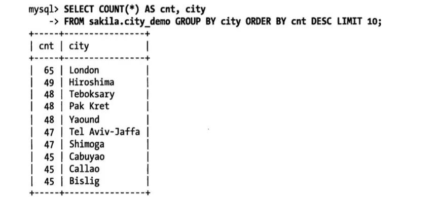 一张表中的一个字段存储的各个城市的名字。首先,我们找到最常见的城市列表:
