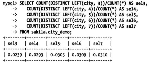 这是完整列的选择性。然后我们看下当前缀索引分别为3,4,5,6,7时的选择性为多少: