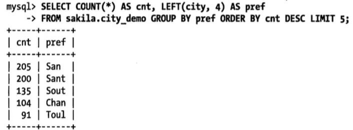 可以看到最常出现的前缀次数要比最常出现的城市次数大很多。即使它们的选择性比较低。找到前缀索引长度后,我们就可以创建前缀索引了: