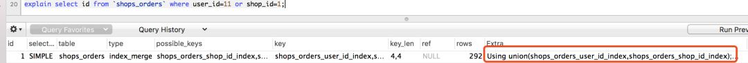 会看到在EXTRA列中,有一个Using union()。而AND条件的相交(intersect)会有一个Using intersect()。