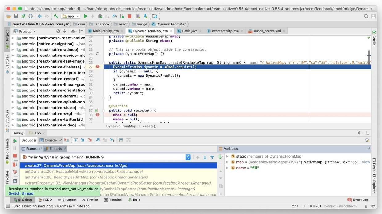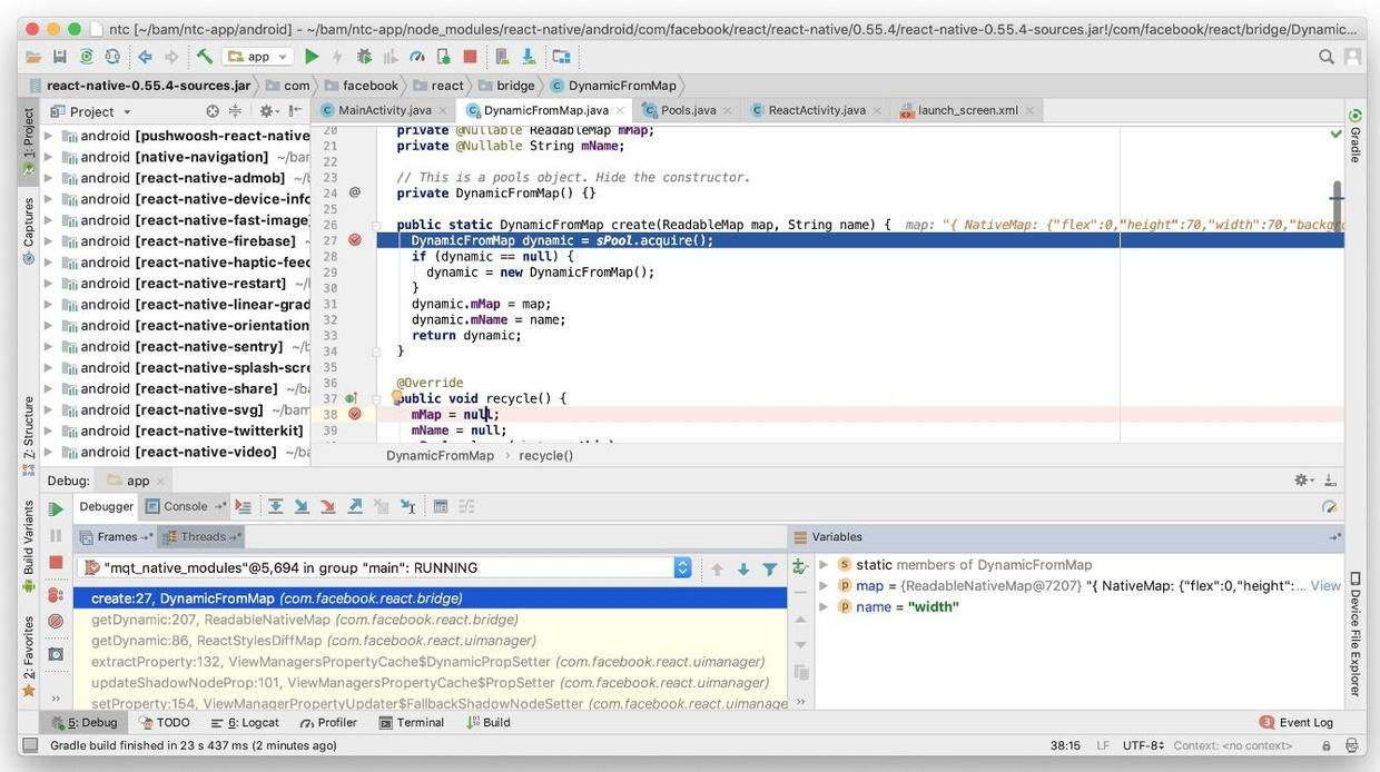 在几十次点击播放按钮后,我们可以通过精心放置的断点查看SimplePool.acquire并通过React Native SimplePool.release调用mqt_native_modules线程来管理React组件的样式属性(在组件下面width)