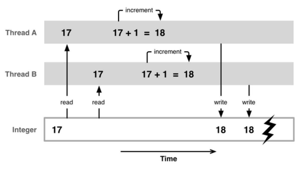 在线程 A 完成更新之前,线程 B 可能会访问数据的值。我们期望它们是两个单独的递增值操作,最终结果为 19,但结果可能会是 18。对于这样情况,数据的最终状态取决于线程操作的顺序,称为竞态条件。竞态条件的问题在于它们不一定总是会发生。对于上述的情况,线程 B 在递增值之前还有更多的工作要做,为线程 A 提供足够的时间来更新值。这就解释了重现崩溃的随机性和不可能性。