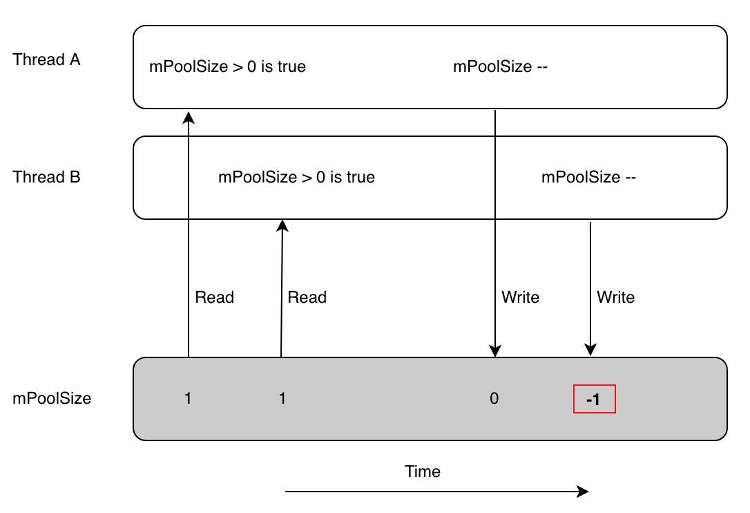 在上图中,线程 A 调用 acquire 方法,得出条件为 true,但尚未减小 mPoolSize 的值(与线程 B 共享),而线程 B 同时调用该方法,并得出相同的条件。然后每个单独的调用都将减少 mPoolSize 的值,这就是为什么你会获得一个错误的值。