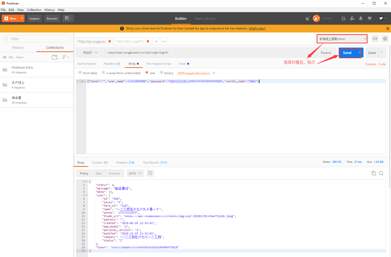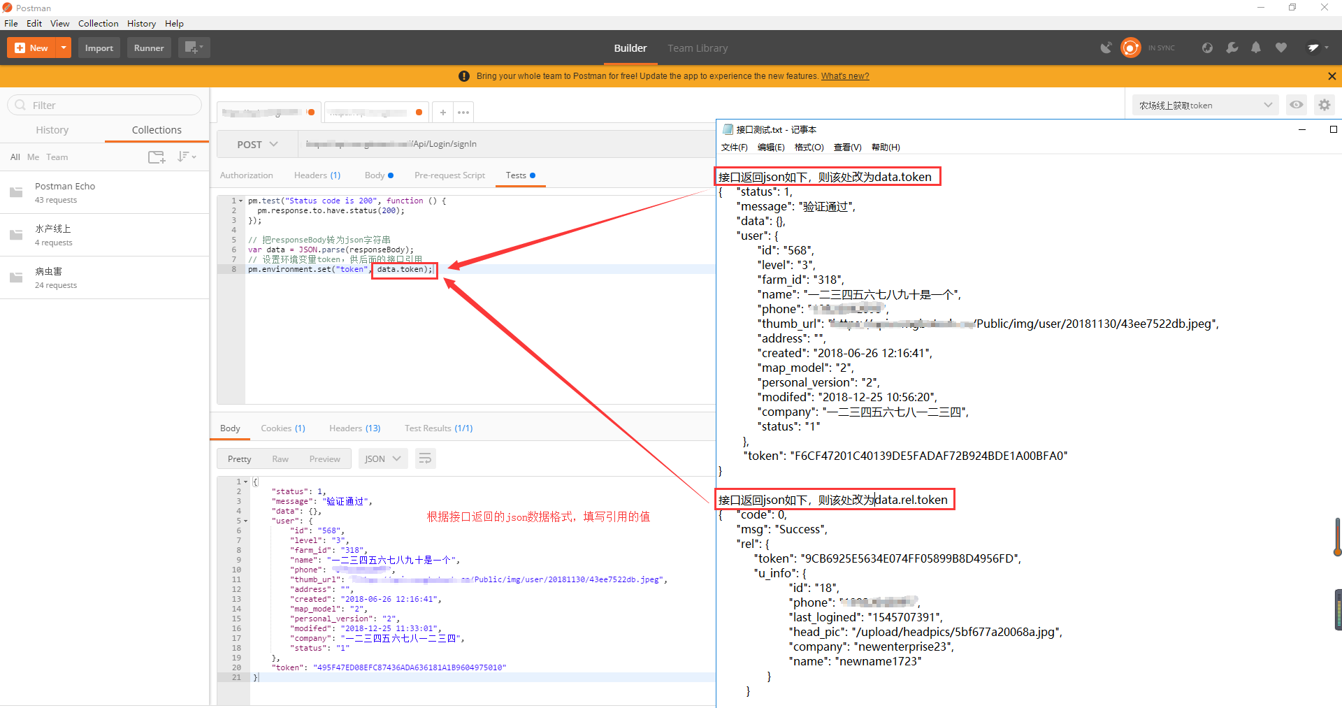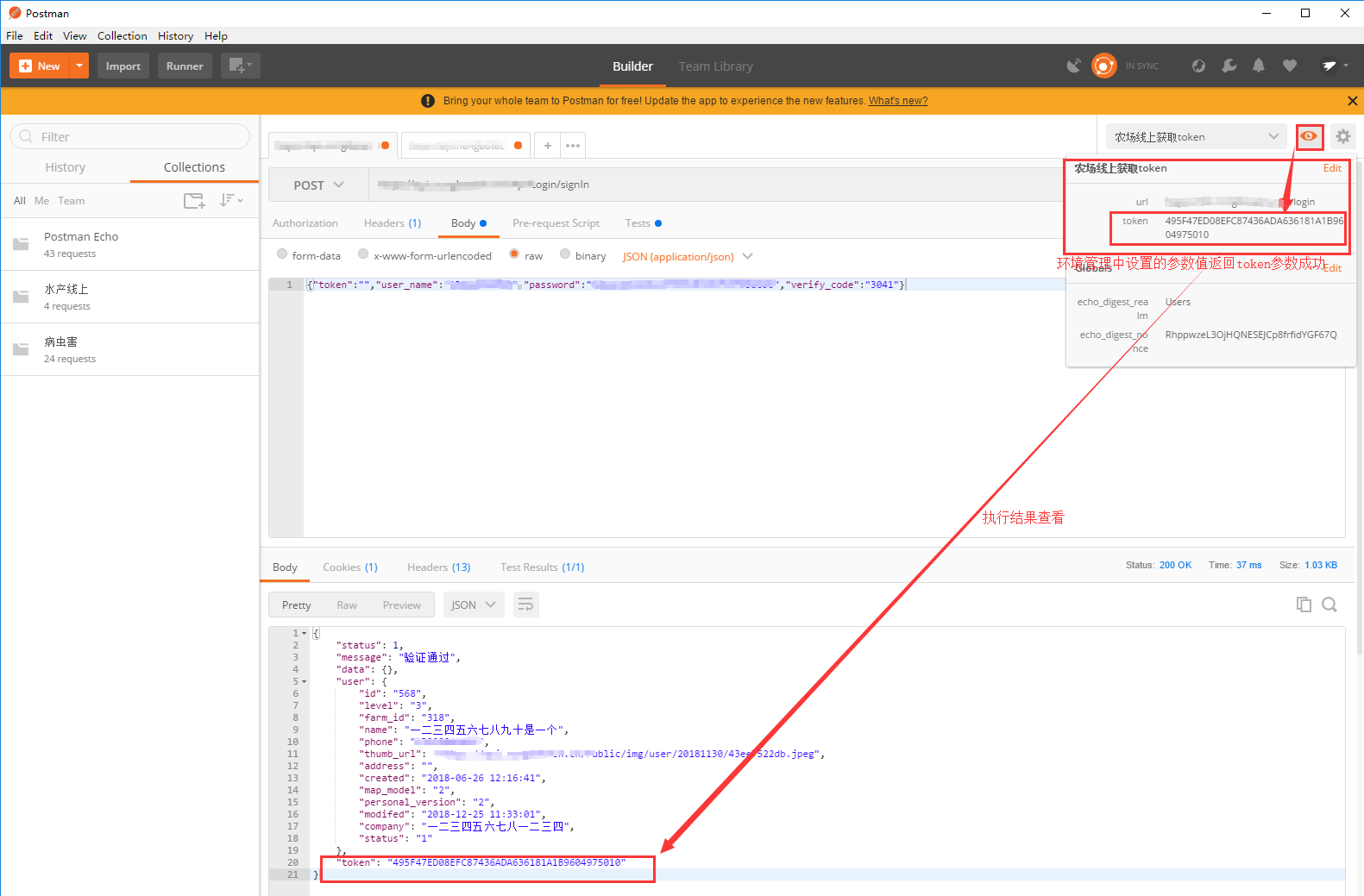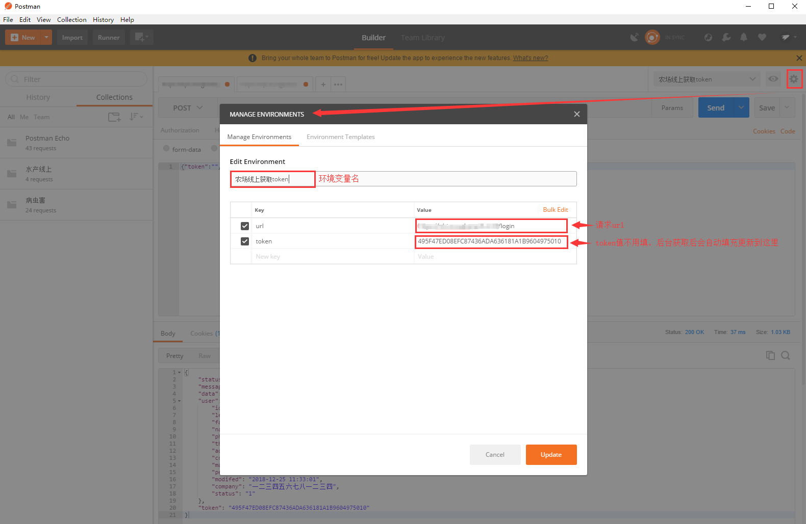 步骤一:在登录接口访问后设置postman的环境变量,例如设置环境变量名:token,值为登录接口访问成功后,在responseBody中的token值