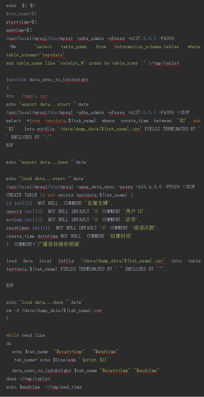 select *from ${tab_name} where create_time between xxx and xxxx into outfile '/data/dump_data/${tab_name}.csv' FIELDS TERMINATED BY ' ' ENCLOSED BY '\"';