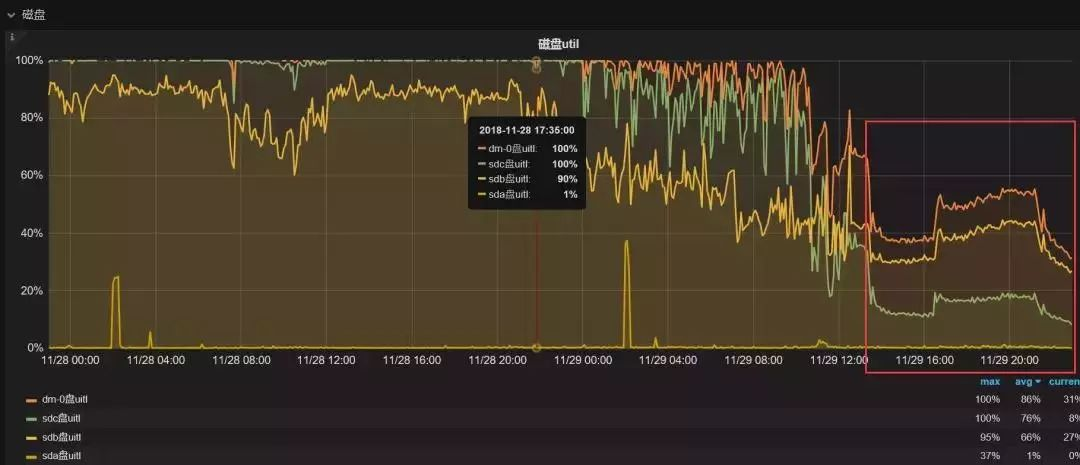 通过数据路由来达到负载均衡,从目前来看效果是很明显的,而在后续要持续的扩容时,对于业务来说也是一种可控的方式。以下是近期的一些优化时间段里从库的IO的压力情况: