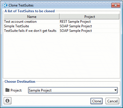 - 在随后的Clone TestSuites对话框中,您可以配置克隆。单击Clone以完成该过程: