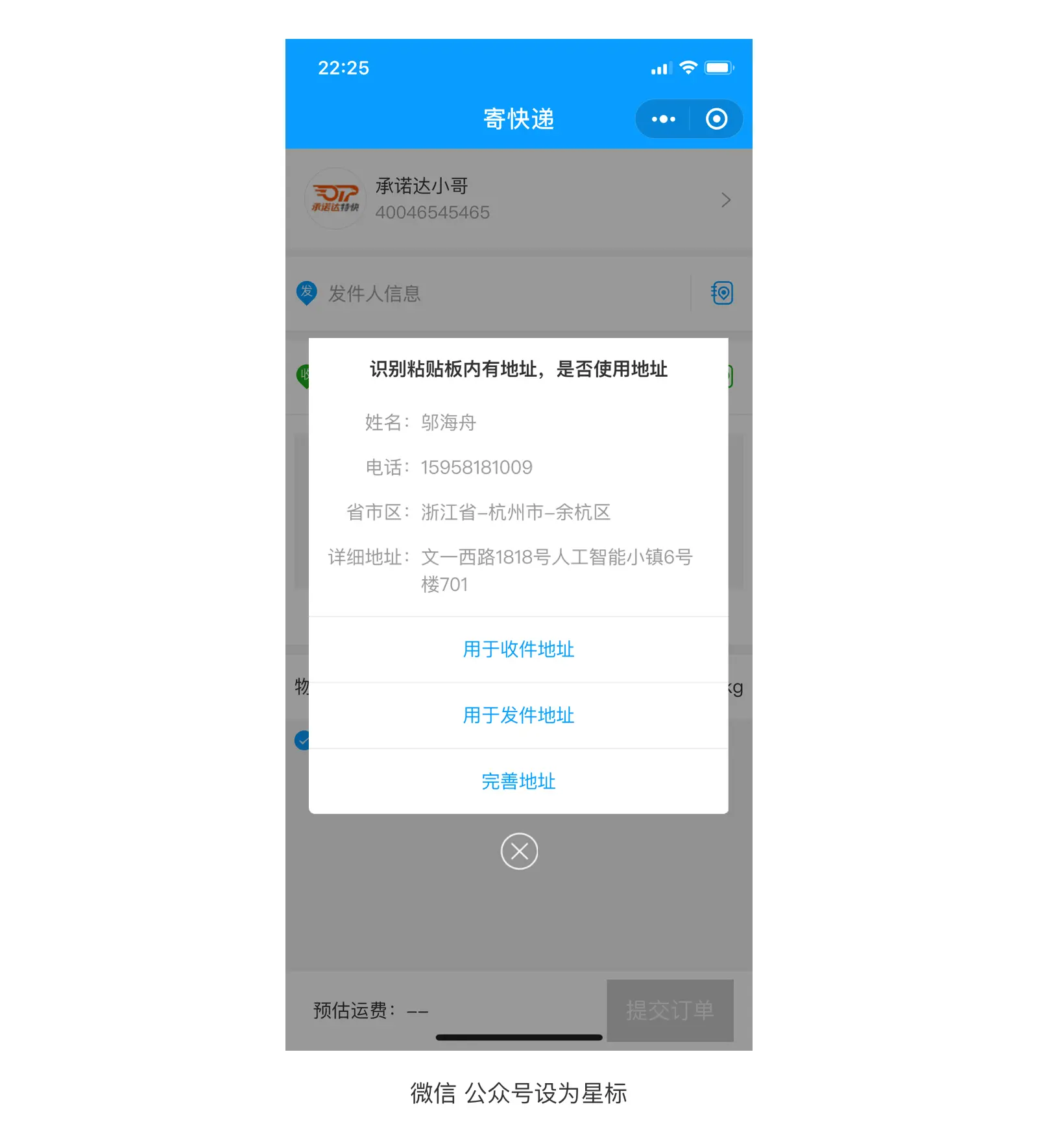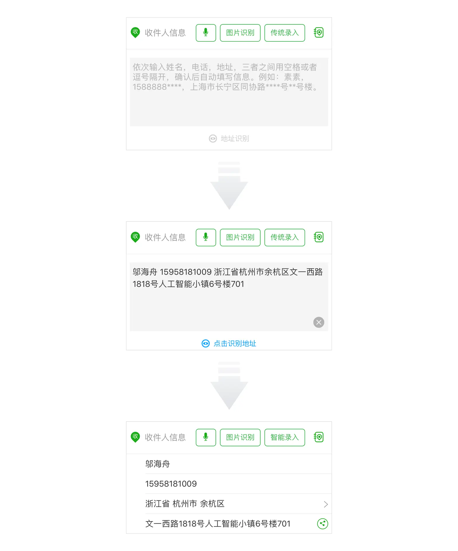 今天的主题要从我前两天的一次寄快递经历说起。因为大部分的情况都是在收(duo)货(shou),很少寄快递,所以对于填写快递单的方式还停留在一年前的手动填写。也正是因为觉得这种方式很麻烦,所以这一年中就算偶有遇到需要寄快递的情形,我也是交由公司的快递小哥代为帮忙。直到前两天,有一个急件需要寄出,于是我硬着头皮去了快递站,正当我在快递站找笔准备填写快递单的时候,老板却让我扫墙上的二维码来填单,顿时心中一阵暗喜,终于不用手写了……但是一想到要一项一项的将表单信息填写完整,不免还是觉得有点麻烦(懒死算了……)。然而,当我打开这个寄快递的小程序后,竟然发现它有智能录入的功能,只需要将姓名电话地址这些信息一起粘贴进去,它就可以分别提取出来填入相应的输入框,如下图: