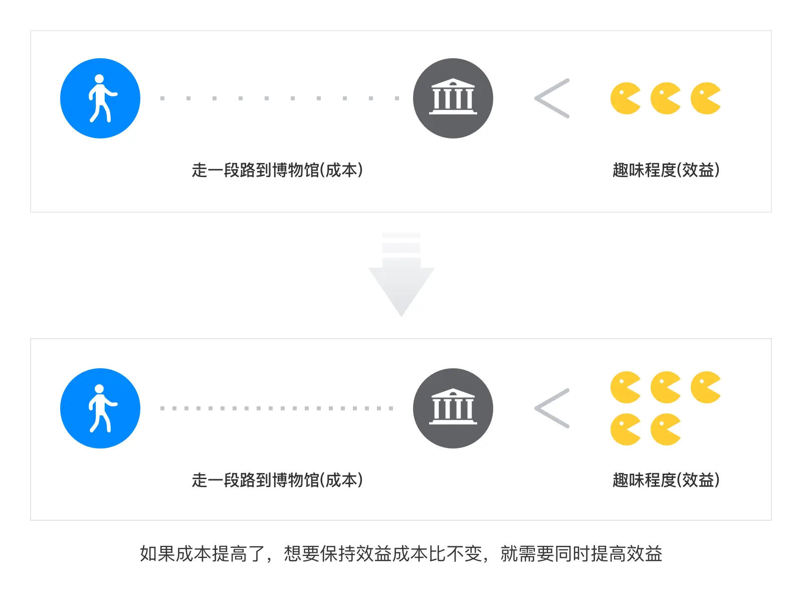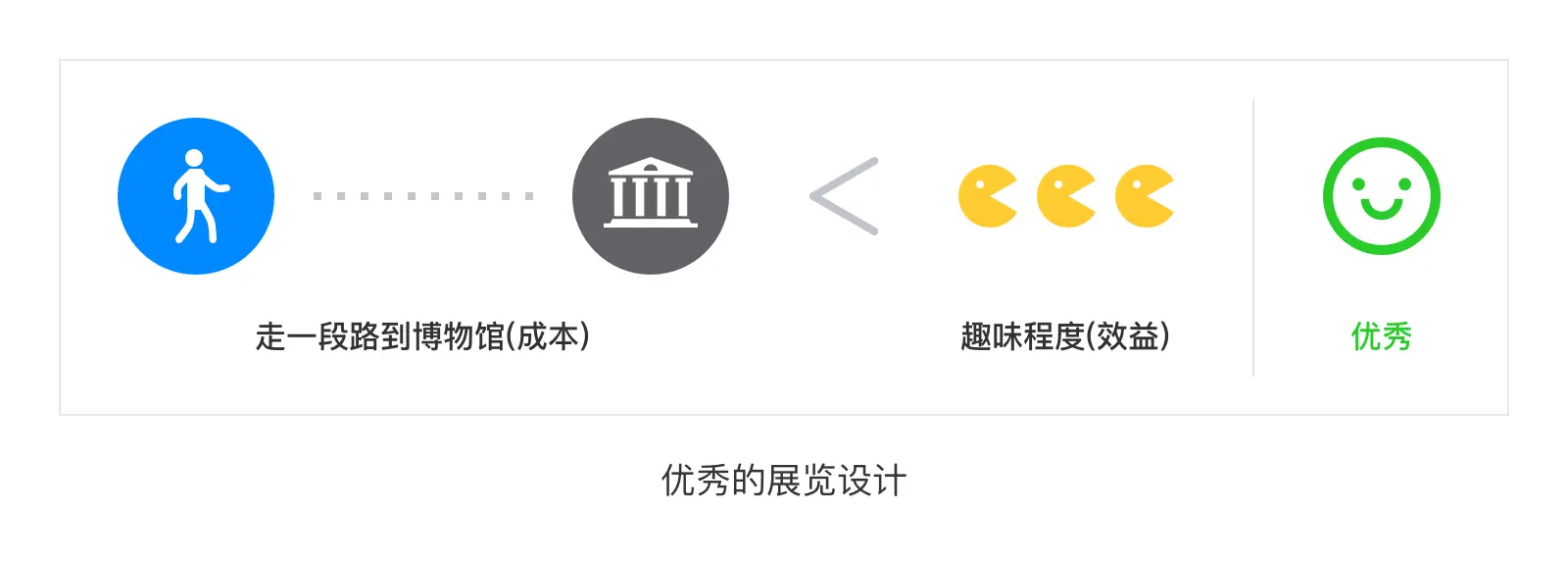 例如:把走一段路到博物馆看展览当做成本,把看展的趣味程度当做效益,如果趣味程度超过走路的成本,那么这个展览设计对于观众来说就是优秀的设计。