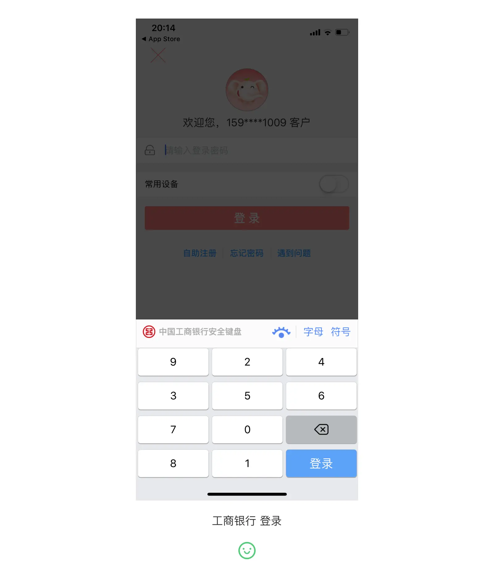 工商银行在用户输入密码时采用了他们自己的安全键盘。我们可以发现,安全键盘上的10个数字是打乱顺序的,并且每次都不一样。乍一看以为这样的设计提高了操作成本,而实际上,这是为了防止一些别有用心的小人,偷窥用户按下的大致位置从而窃取到密码。因此这项设计其实是提高了安全的效益,并且这个效益在资产类产品中是远大于“复杂”的键盘操作成本的。所以,适当地增加成本来换取更高的效益未尝不可。