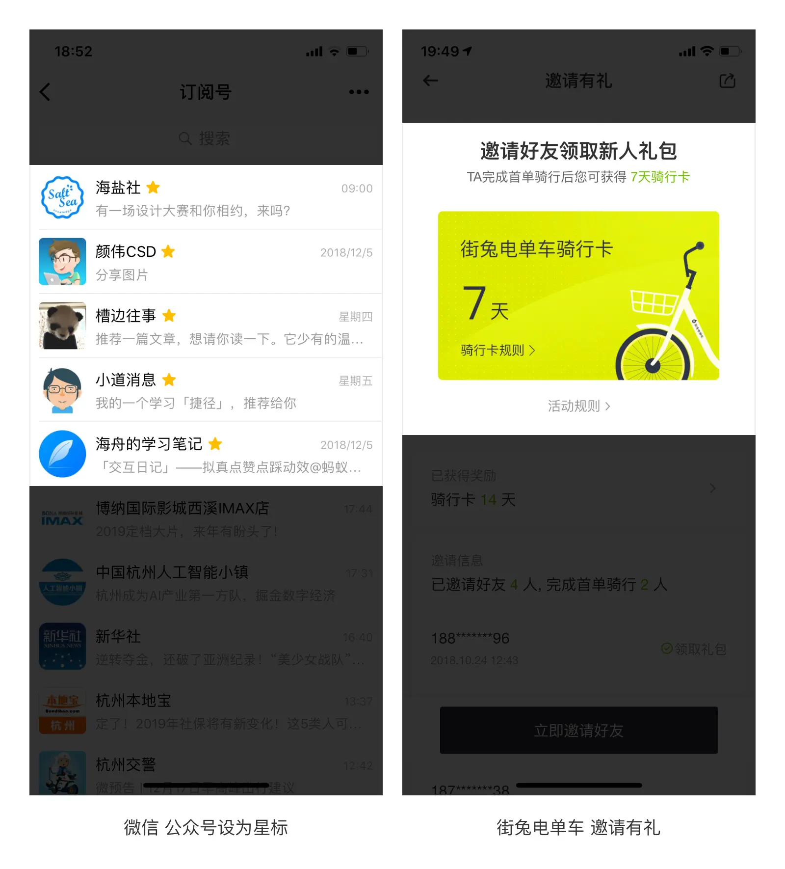 微信公众号中有一些自媒体长期提供高质量的内容,用户愿意花费一定的操作成本将他们设为星标。同样,一些产品的拉新活动奖励诱人,用户也愿意花费一定的时间和精力成本去获取这个奖励。正因为用户愿意付出成本,所以这两种情况我们认为是高效益的体现。