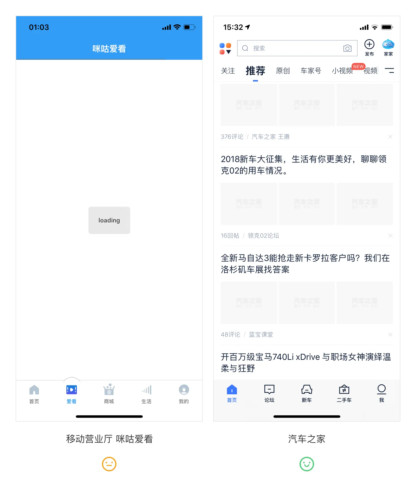 汽车之家通过懒加载的方式,将文字等资源较小的内容优先加载,随后再加载图片及视频等较大的资源。这样用户就可以先处理文字信息,随后再处理图片信息,如此这般,等待的时间就变少了。而另一边咪咕爱看则完全是枯燥的等待。