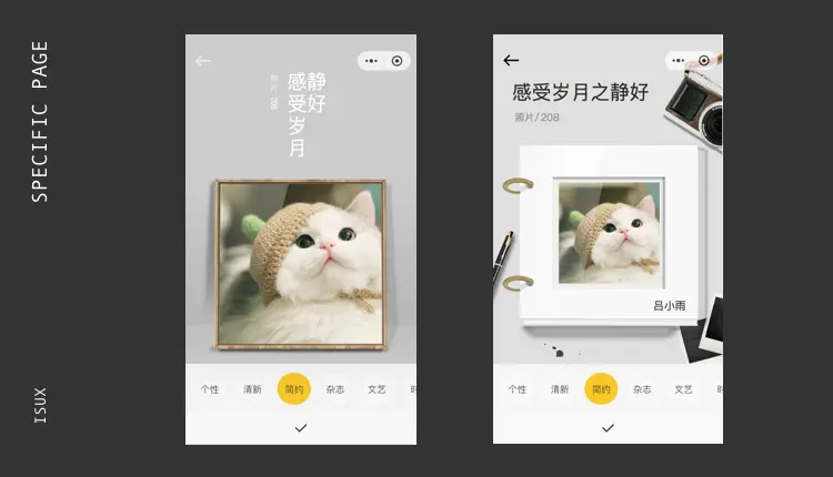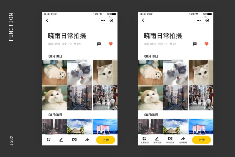 分享:分享应该是我们最愿意用户操作的行为,因为这样不但可以提高用户粘性,还可以让我们产品拓展更多的新用户所以我们需要在结构上,让用户轻易的找到分享入口由于小程序是不允许直接分享朋友圈的,所以我们希望通过照片海报的形式,把图片分享到朋友圈,让好友扫描二维码进入小程序查看更多照片。