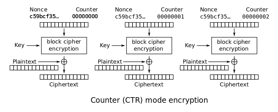 与 CBC 不同,它的优点是可以进行并行加密并且所有块都依赖于 IV,而不仅仅是第一个。一个很严重的警告是,IV 永远不能被相同的密钥重用,因为攻击者可以从中轻松计算出你所使用的密钥。