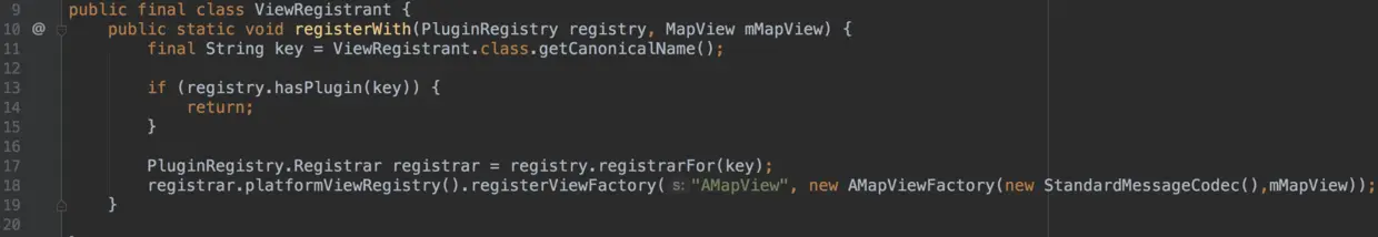 第三步:使用registerViewFactory()方法注册刚刚写好的PlatformViewFactory,该方法需要传入两个参数,第一个参数需要和之前在Flutter端写的viewType对应,第二个参数是刚刚写好的的PlatformViewFactory。