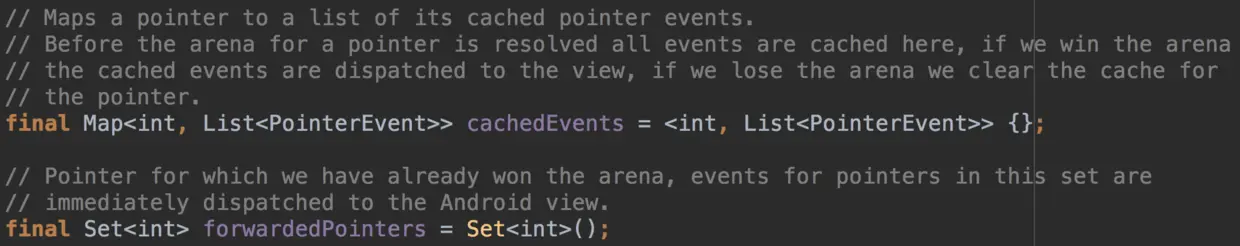 cachedEvents和forwardedPointers,只有当PointerEvent的pointer属性在forwardedPointers中时才会去进行分发,否则会存在cacheEvents中。这里的实现主要是为了解决一些事件的冲突,比如滑动事件,可以通过gestureRecognizers来进行处理,这里可以参考官方注释。