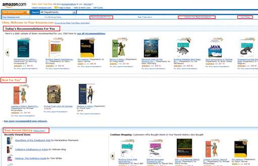 另外,Amazon 很多推荐是基于用户的 profile 计算出来的,用户的 profile 中记录了用户在 Amazon 上的行为,包括看了那些物品,买了那些物品,收藏夹和 wish list 里的物品等等,当然 Amazon 里还集成了评分等其他的用户反馈的方式,它们都是 profile 的一部分,同时,Amazon 提供了让用户自主管理自己 profile 的功能,通过这种方式用户可以更明确的告诉推荐系统他的品味和意图是什么。