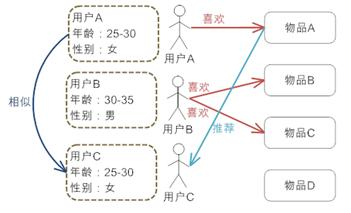 从图中可以很清楚的看到,首先,系统对每个用户都有一个用户 Profile 的建模,其中包括用户的基本信息,例如用户的年龄,性别等等;然后,系统会根据用户的 Profile 计算用户的相似度,可以看到用户 A 的 Profile 和用户 C 一样,那么系统会认为用户 A 和 C 是相似用户,在推荐系统中,可以称他们是“邻居”;最后,基于“邻居”用户群的喜好推荐给当前用户一些物品,图中将用户 A 喜欢的物品 A 推荐给用户 C。