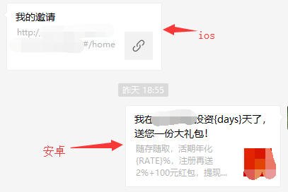 解决方法:在分享链接后面增加'?&'及可分享成功,例:link: self.link(域名) + self.share.invite_share_url(router名字) + "?&",经测试,没参数时加?,有参数时加&就行,这种方式要注意下一个页面取参数的问题。 - 3.带query参数的页面分享,ios安卓均分享失败,而且所有debug均为true,但是两者表现不同,安卓分享出去样子上表现为分享成功,但是实际点进去不是要分享的页面,而是首页。ios表现特别明显,就是分享失败的样子,图片如下