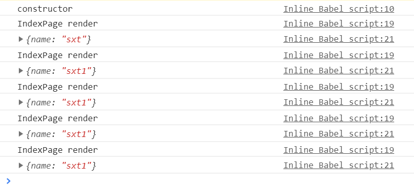 5.父组件继承Component,子组件继承Component时:初始化是会输出constructor,IndexPage render,example render,当我们第一次点击按钮以后,界面发生变化,后面就不再改变,因为我们一直把它设置为sxt2,但是每点击一次都会输出IndexPage render,example render,因为每次不管父组件还是子组件都会渲染