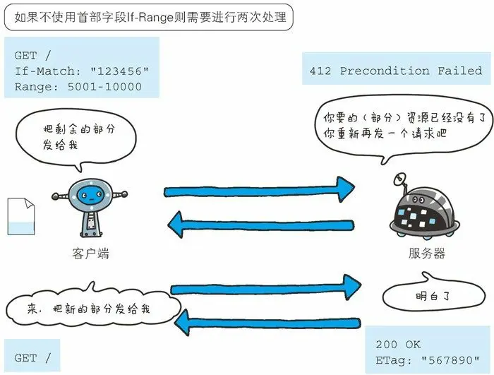 客户端请求服务器资源的时候会在请求首部的字段中携带一个if-match值,这个值是服务器之前返回客户端资源是携带的ETag值,当服务器看到有if-match的时候就会和服务器资源的ETag(服务器上的资源都会通过某种算法来给资源生产一个唯一标识符的ETag)进行比较,如果发现if-match!==ETag,服务器就会返回状态码412。