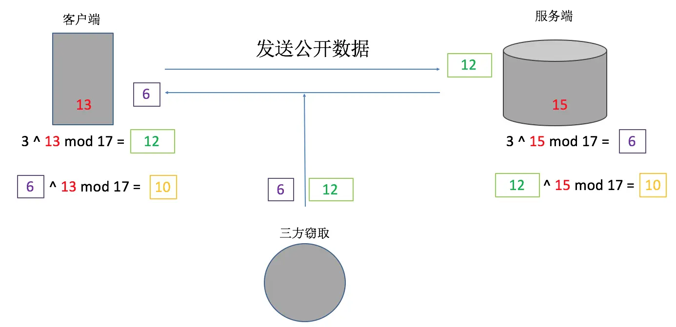 客户端用3 的 13次方 mod 17 = 12 然后将得到的结果12公布出去。