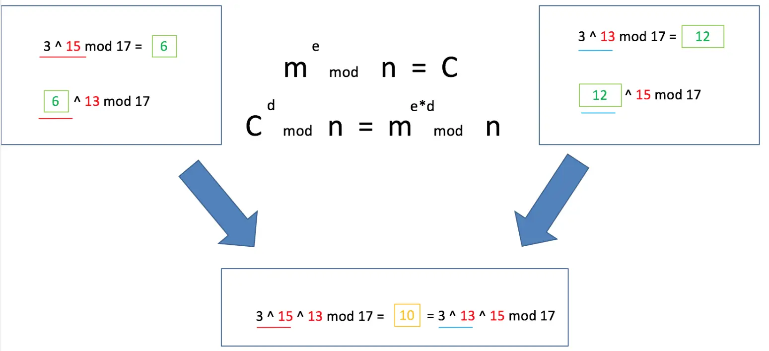 为什么 6的13次方会和12的15次方得到一样的结果呢?因为这就是规律,我们可以用小一点的数字测试一下3^3 mod 17 = 10和10 ^ 2 mod 17 ; 3 ^ 2 mod 17 = 9和9^3 mod 17结果都是15。迪菲赫尔曼密钥交换最核心的地方就在于这个规律