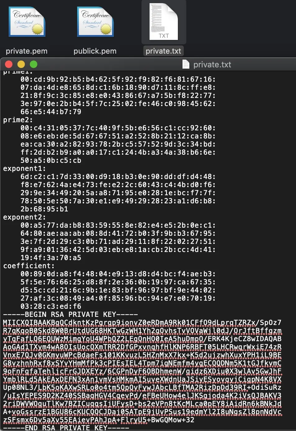 我们可以看到base64编码,明显私钥二进制很大,公钥就小了很多。 这时候我们的文件夹内已经多了刚刚生成好的公私钥文件了