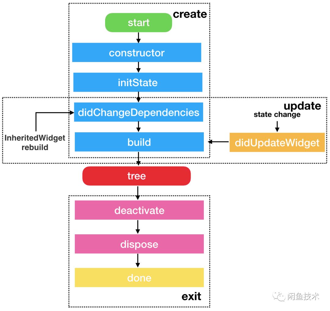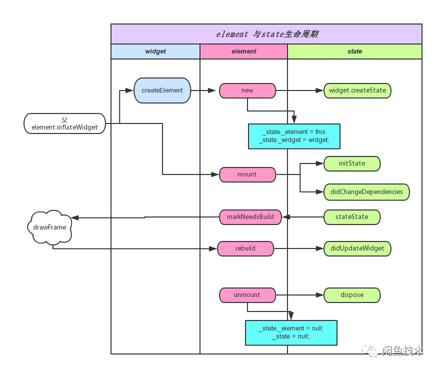 element是由widget createElement所创建。state的生命周期状态由element调用触发。