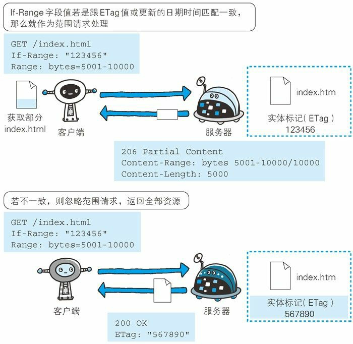 步骤1:客户端实现断点请求或者范围请求时会遇到这类状态码,比如我有一个视频昨天下载一半,由于某种原因我断开下载了,今天我又要下载这个视频,那么请求首部字段就会添加If-range:‘345345’;range:bytes=‘50001-10000’给服务器。