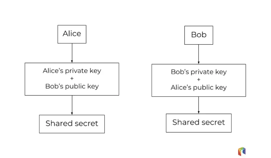 互换公钥后便可使用一种称为椭圆曲线密钥交换体制(ECDH)(见维基百科)的常见技术创建双方的“共享密钥”。(https://en.wikipedia.org/wiki/Elliptic-curve_Diffie%E2%80%93Hellman)