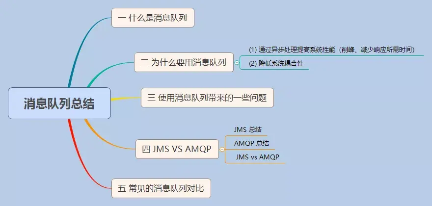 备注: 不要认为消息队列只能利用发布-订阅模式工作,只不过在解耦这个特定业务环境下是使用发布-订阅模式的。除了发布-订阅模式,还有点对点订阅模式(一个消息只有一个消费者),我们比较常用的是发布-订阅模式。 另外,这两种消息模型是 JMS 提供的,AMQP 协议还提供了 5 种消息模型。