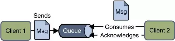 使用队列(Queue)作为消息通信载体;满足生产者与消费者模式,一条消息只能被一个消费者使用,未被消费的消息在队列中保留直到被消费或超时。比如:我们生产者发送100条消息的话,两个消费者来消费一般情况下两个消费者会按照消息发送的顺序各自消费一半(也就是你一个我一个的消费。)